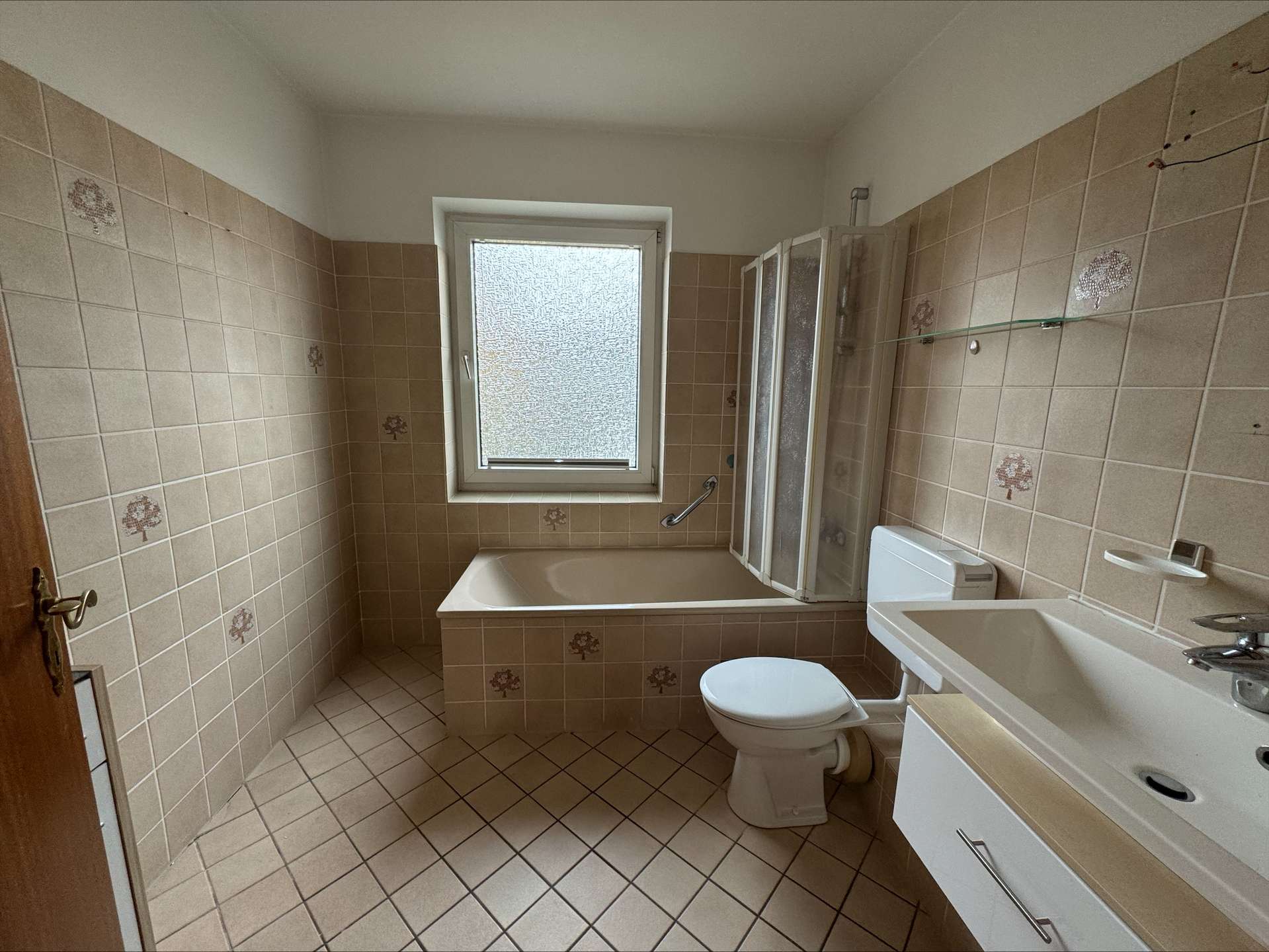 – Badezimmer mit Fenster, beige/weiße Sanitärobjekte, Badewanne mit Duschabtrennung, Waschtisch, Waschtischunterschrank, Spiegelschrank, Toilette