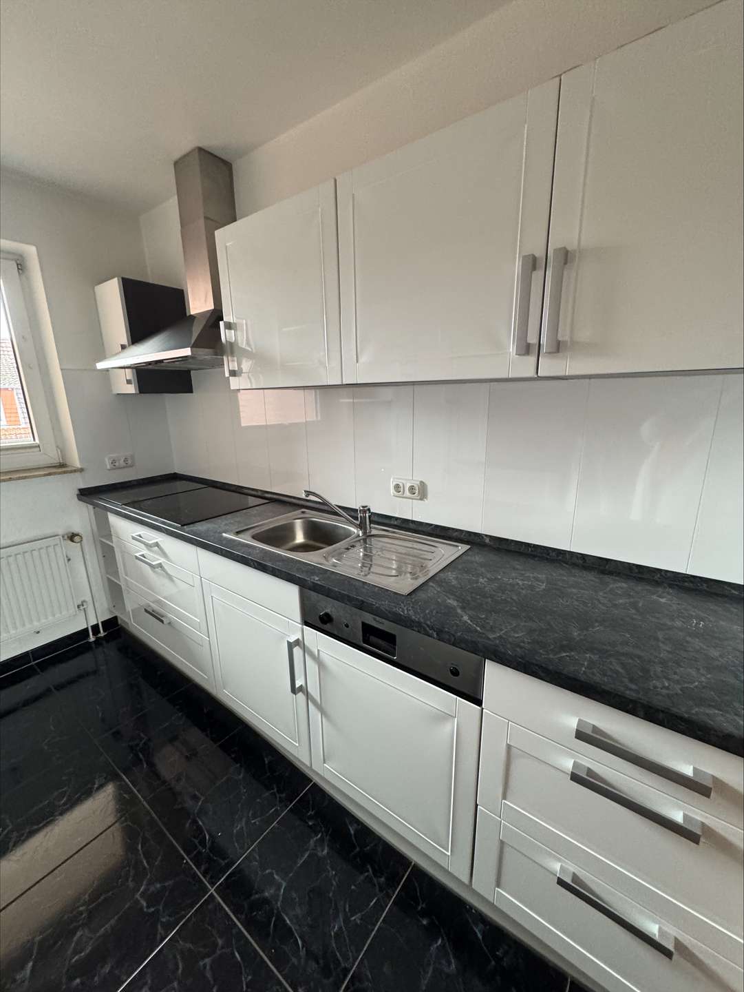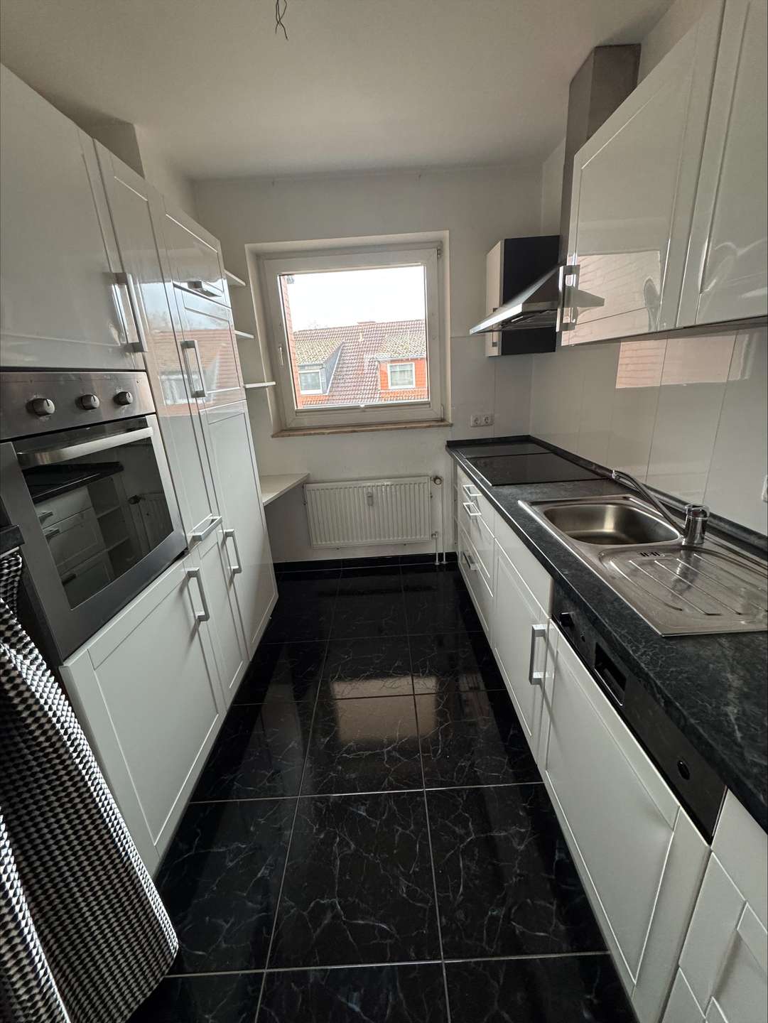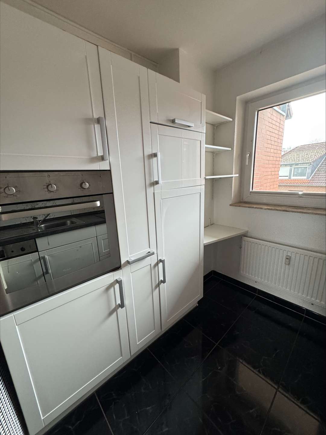 – moderne, weiße Einbauküche mit Elektrogeräten (Ceran-Kochfeld, Backofen, Dunstabzug, Geschirrspüler, Kühlschrank, Gefrierfach)