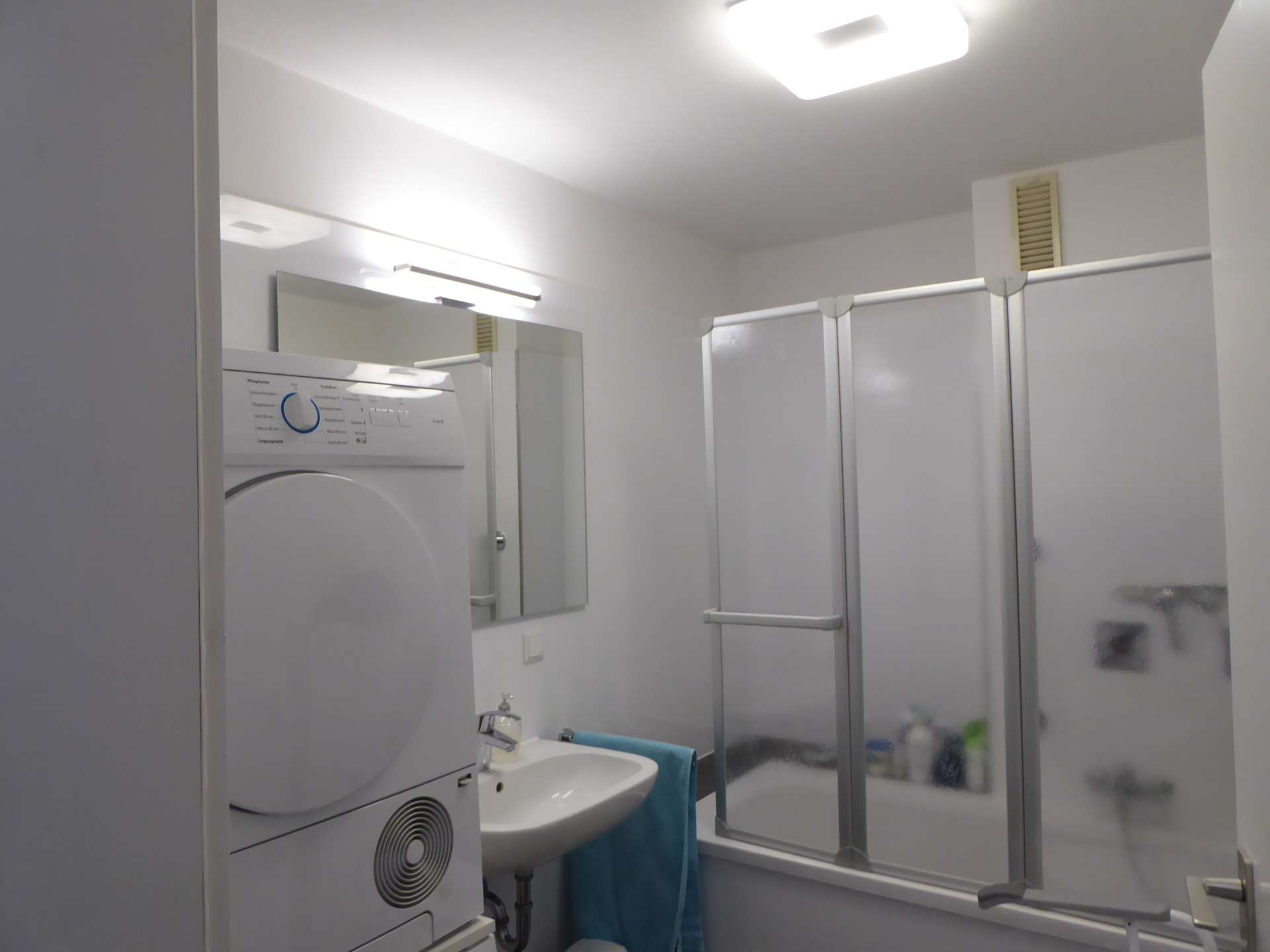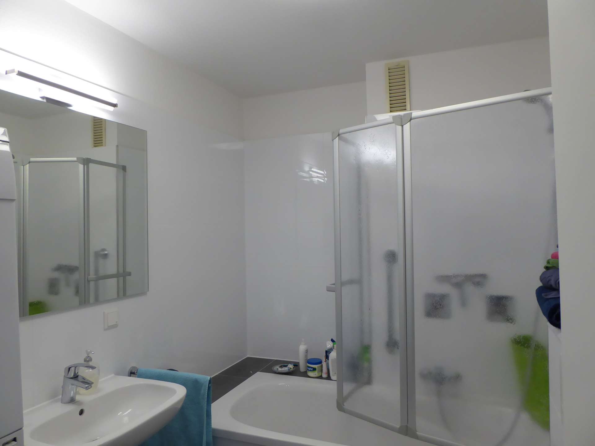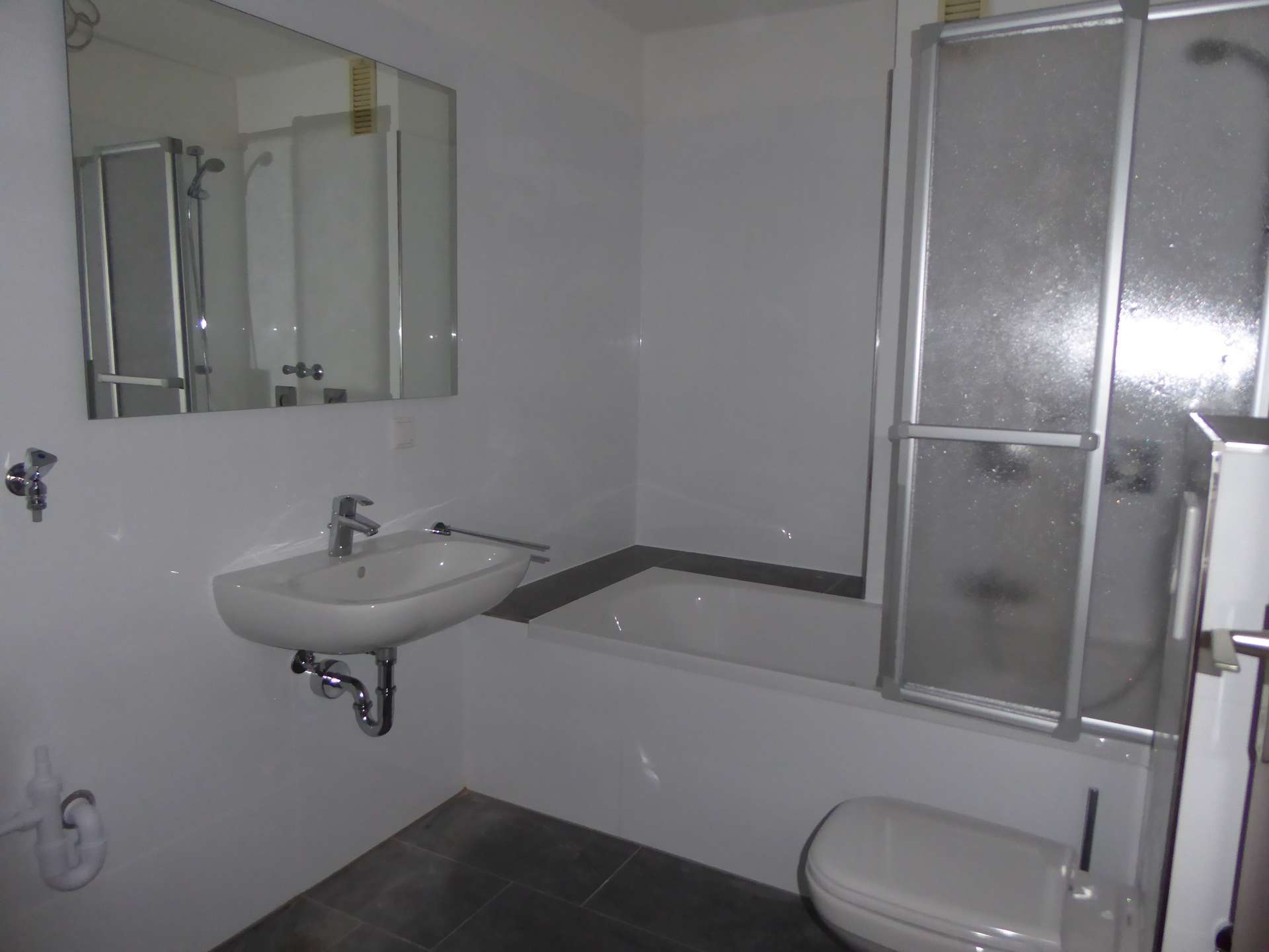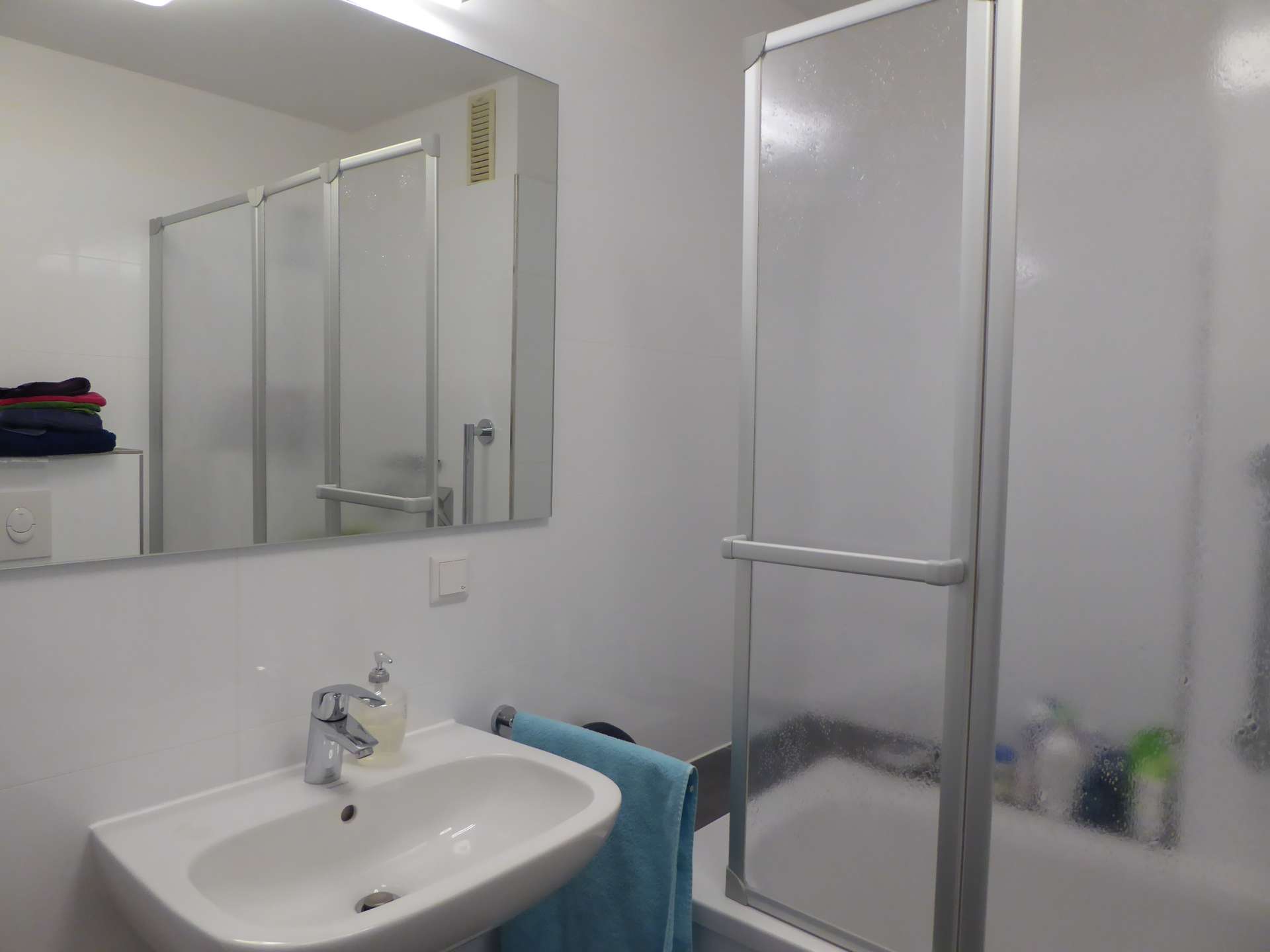 – Badezimmer: Badewanne mit Glasabtrennung, Waschtisch, Spiegelschrank und Toilette